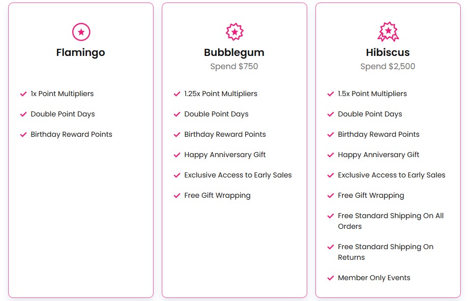 Your Pink Perks tier is determined by the amount you spend over a rolling 12-month period. Once you reach a certain spending tier, there is a 30-day delay before you become eligible for that tier's benefits, which last for one year from the date of eligibility. Each tier also retains perks from previous tiers.